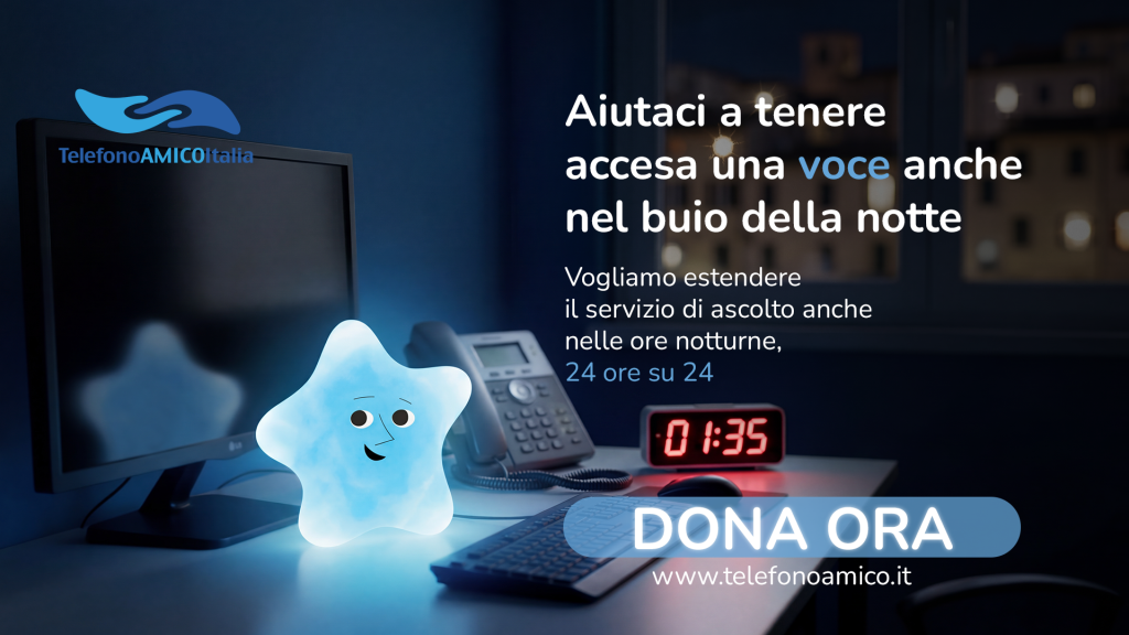 è la campagna che porta il servizio di ascolto di Telefono Amico Italia alle 24 ore su 24, tutti i giorni dell’anno.